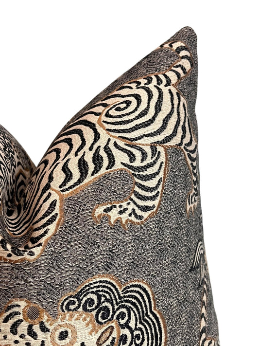 Tiger dragon Chinoiserie Pillow, Grey Katmandu Tibetan dragon Pillow Cover, Designer Pillow Cover, Oriental Tiger Pillow, Foo dog Pillow