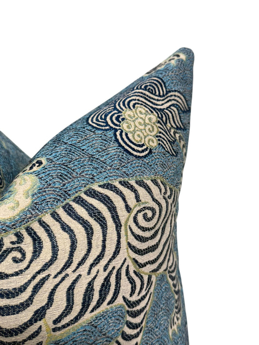 Oriental Tiger Pillow, Tiger dragon Chinoiserie Pillow,Azure Blue Katmandu Tibetan dragon Pillow Cover, Designer Pillow Cover, Foo dog