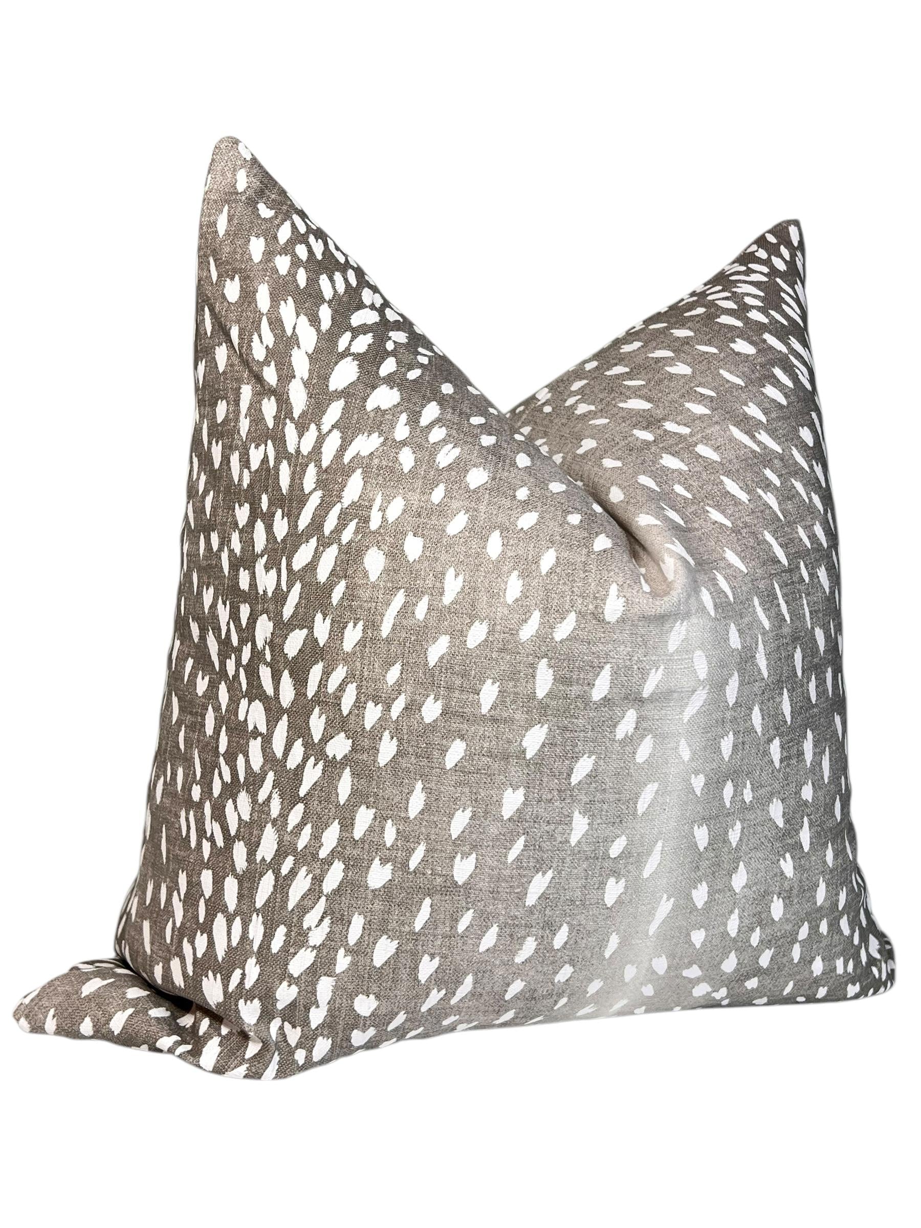 Antelope Print Pillow Cover, featuring a neutral beige and white spotted design that's perfect for modern, rustic, or boho-inspired interiors. Handmade in the USA, this decorative throw pillow cover is crafted with care, offering a stylish and luxurious accent for your couch, bed, or chair.